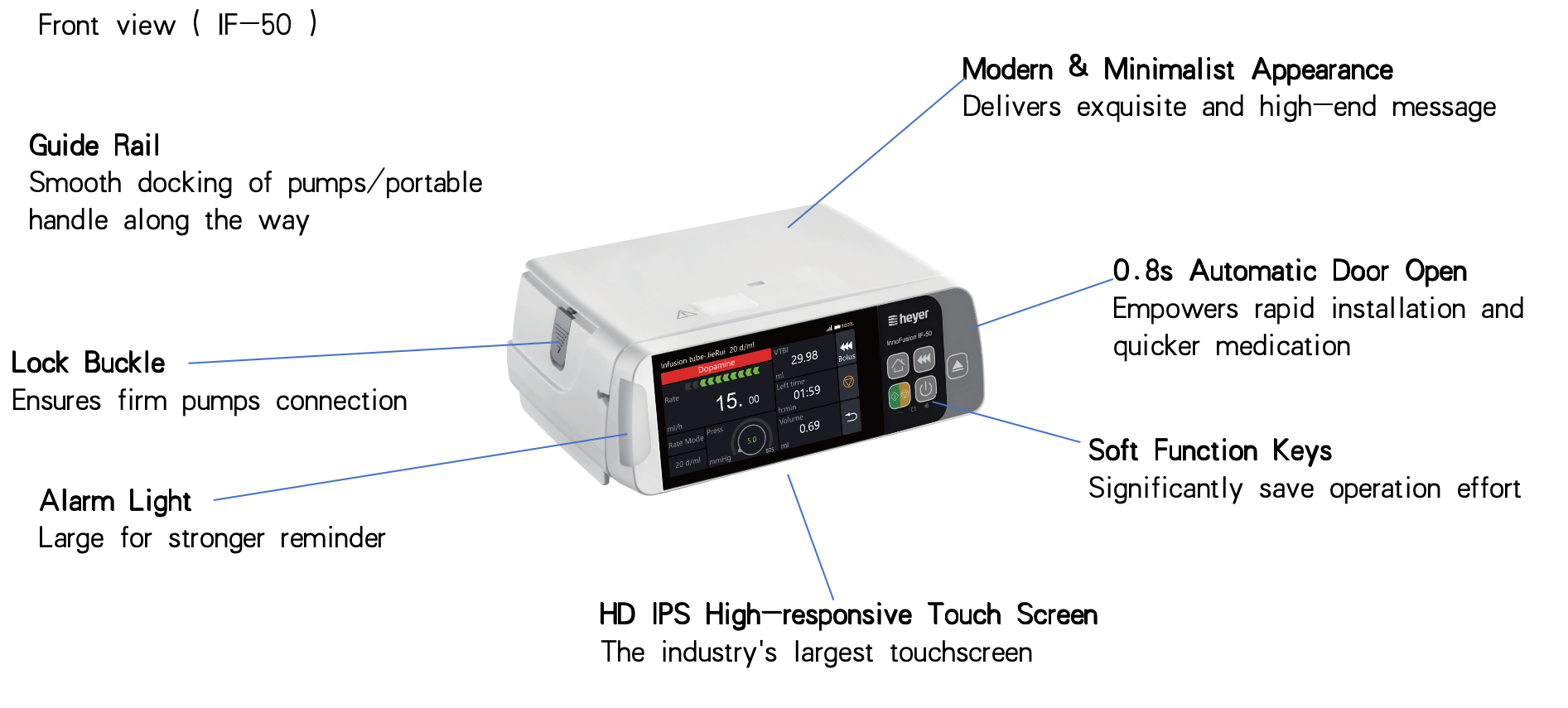 IF-50: Versatile All-in-one Infusion System(blood transfusion , drug infusion , enteral nutrition feeding),catering to Various Clinical Purposes Drug library : Medication Safety—SmartDrugTM Intelligent Drug Library. Dose Error Reductlon System (DERS) The drug library is customizable The Industry’s Largest Medical Grade Touch-screen, operate the pump just like a phone, easy to operation Intelligent Infrared Recognition Technology-driven Relay Infusion Long battery life up to 10 hours at 25ml/h The Industry’s Leading Waterproof Level with Waterproof Patent IP44 Applicable to all hospitals and departments, widely used in intravenous infusion therapy