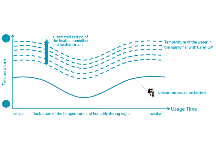 CareHumi The CPAP system intelligently adjusts temperature and humidity levels to output a 90% RH airflow in response to environmental temperature, humidity and patient airflow variations, ensuring comfort during breathing.
